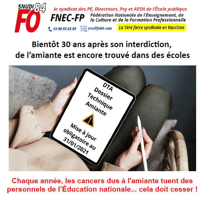 | Les élus du personnel FO interviennent à chaque fois que c’est nécessaire auprès de la Direction académique pour obtenir la mise à jour des Dossiers Techniques Amiante (DTA) des écoles, les documents obligatoires qui sont soit inexistants, soit non-conformes à la réglementation en vigueur qui prévoyait leur mise à jour au plus tard avant le 1er février 2021 (décret du 3 juin 2011). En effet, le propriétaire des locaux a l’obligation de faire réaliser un DTA et de le mettre à jour.