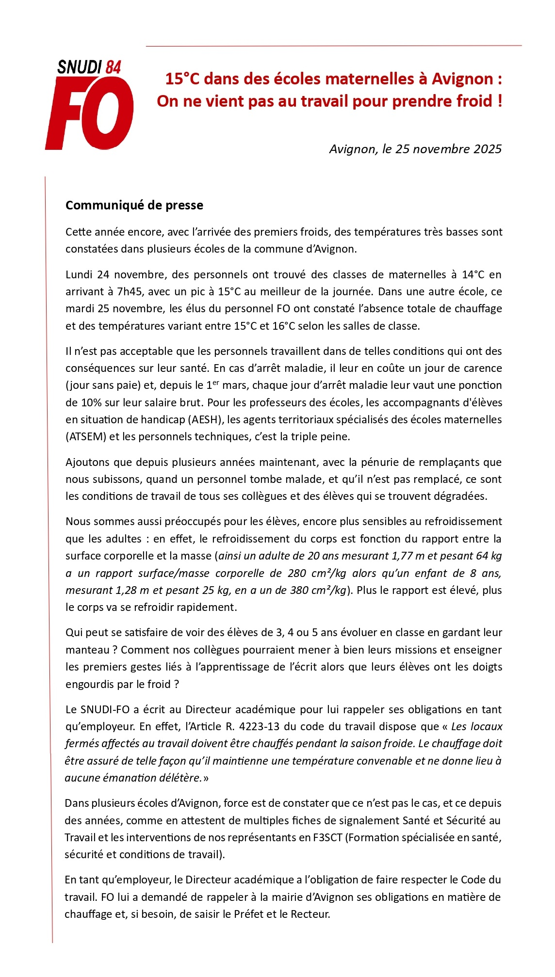 Pourtant, en ce début d’année scolaire 2024/2025, alors que l’amiante est interdit depuis 1997 dans la construction des bâtiments publics, FO a encore constaté un risque de contamination par ce matériau cancérigène dans une école maternelle de la ville d’Avignon et a déposé un signalement de Danger Grave et Imminent (DGI) afin de protéger les personnels et les élèves. En effet, des dalles de sol amiantées dégradées s’étaient décollées à cause de l’infiltration régulière d’eau de pluie, rendant possible la diffusion dans l’air de fibres d’amiante. Suivant nos préconisations inscrites dans le signalement de Danger Grave et Imminent, l’Administration a fait évacuer la salle de classe concernée et des travaux y ont été réalisés par une entreprise spécialisée afin de faire cesser tout risque. L’amiante est aujourd’hui « encapsulé » et ses fibres ne peuvent plus se propager dans l’air. Début décembre, FO a demandé au Directeur académique qu’il contacte les services de la municipalité d’Avignon pour obtenir la mise à jour du Dossier Technique Amiante de l’école Sainte Catherine à Avignon. En effet, avec un DTA daté du 23 juin 2004, la mairie ne respecte pas les obligations réglementaires prévues à l’article R 1334-18 du Code de la Santé Publique. La présence d’amiante dans les locaux n’ayant pas été mesurée depuis 21 ans, avec la dégradation dans le temps des matériaux de construction et d’isolation, la sécurité des personnels et des élèves ne peut être garantie. Force Ouvrière rappelle que le Directeur académique, en tant que représentant de l’État, notre employeur, est soumis au Code du travail et notamment à l’Article L4121-1 qui précise que : « L’employeur prend les mesures nécessaires pour assurer la sécurité et protéger la santé physique et mentale des travailleurs. » La mise à jour du DTA est la première étape pour mettre en sécurité l’ensemble des personnels et des élèves. En tant que propriétaires, les communes ont l’obligation d’effectuer cette démarche, ainsi que les travaux nécessaires en cas d’amiante à l’air libre. À Avignon, combien de personnels des écoles ont été exposés à l’amiante depuis 1997 ? Suite à notre courrier au Directeur Académique, l’Inspectrice Santé et Sécurité au Travail de l’académie d’Aix Marseille nous a informés qu’elle avait demandé aux services de la Mairie d’Avignon de lui transmettre l’ensemble des DTA des écoles d’Avignon. Vos élus FO à la Formation Spécialisée en matière Etienne RAOUL, Marie Antoinette MOSCA, |
