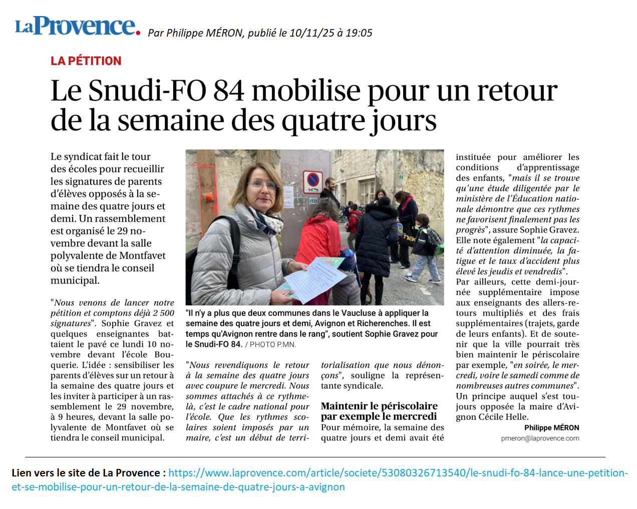 https://www.laprovence.com/article/societe/53080326713540/le-snudi-fo-84-lance-une-petition-et-se-mobilise-pour-un-retour-de-la-semaine-de-quatre-jours-a-avignon