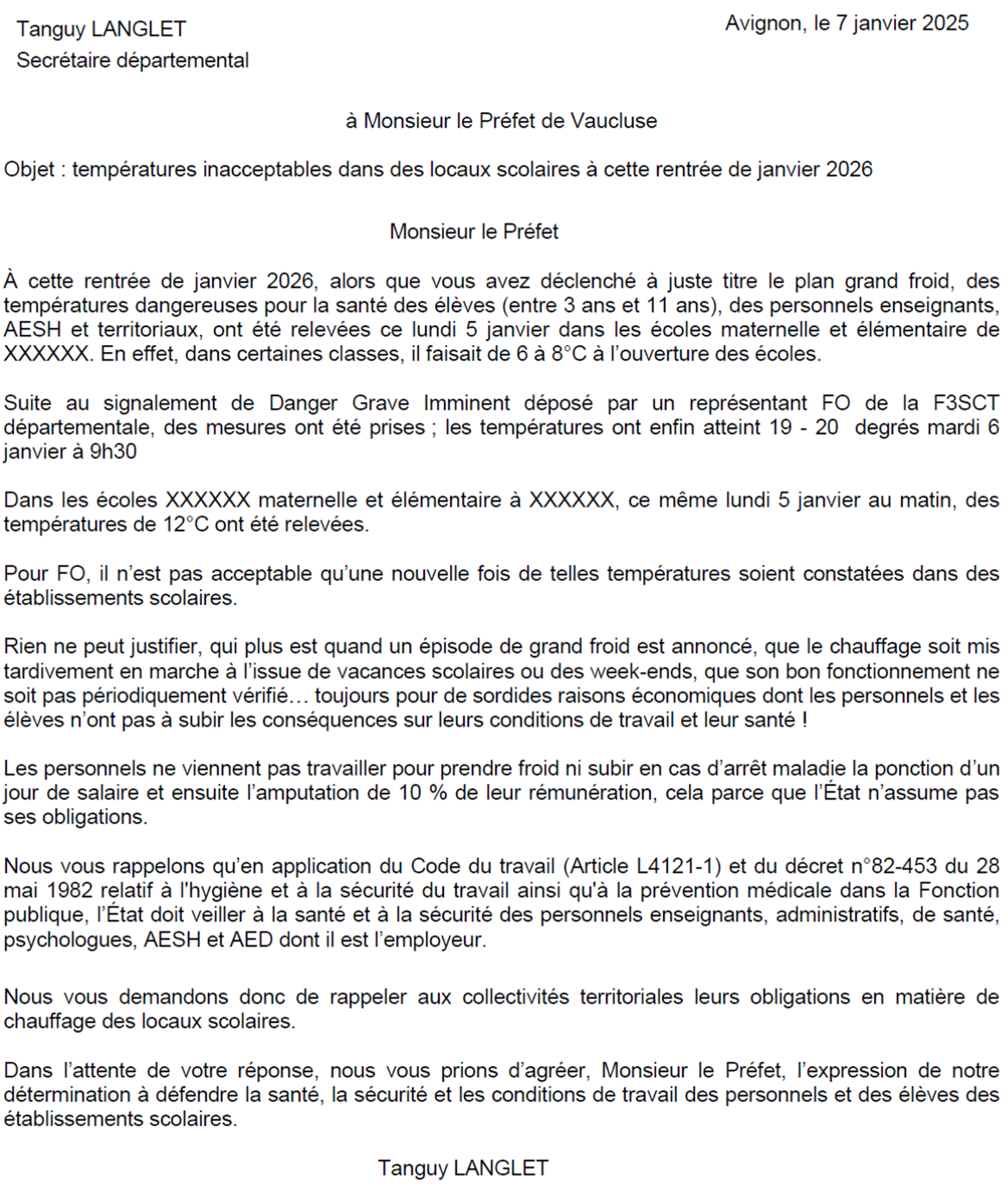 Si vous êtes confrontés à des températures trop basses dans votre classe, FO vous invite à remplir une fiche de signalement de danger grave et imminent (à télécharger ici) en cochant la case « Droit d’alerte avec retrait »